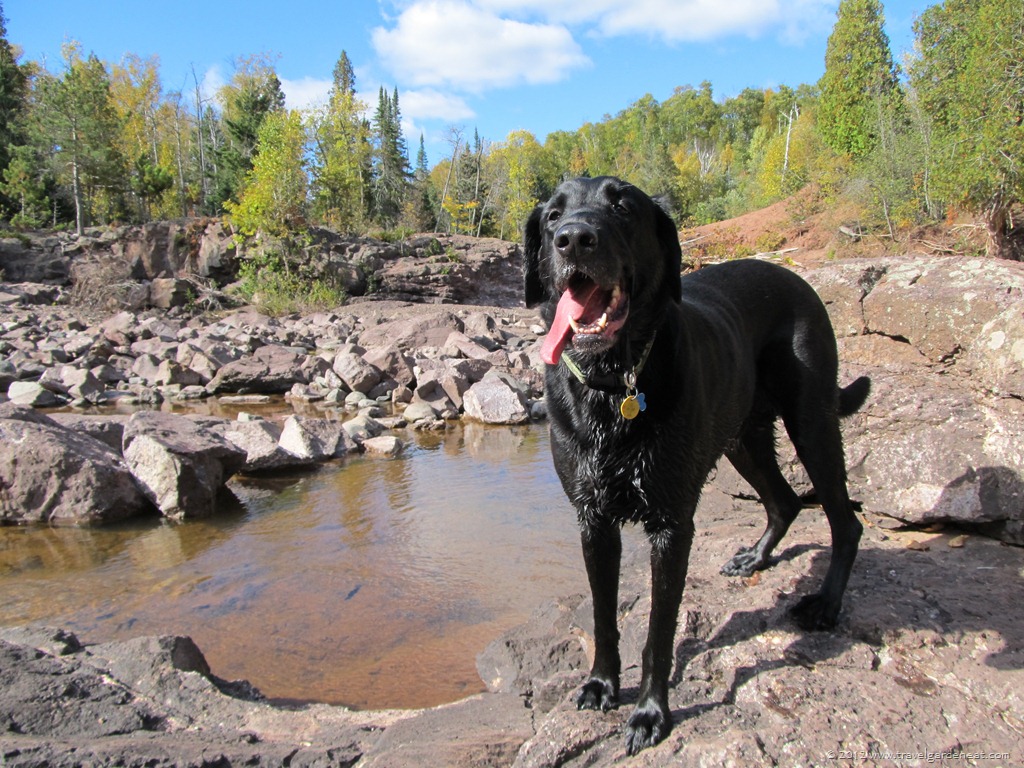 Moving inland away from Lake Superior’s cool breeze, we broke a sweat as we hiked along, and as soon as our lab sensed water was nearby, he started tugging at the leash. For some reason, I thought it would be more convenient to put my trusty friend on the jogging leash (hands-free, attaching around my waist with a bungee-type extension leading to the dog), and free my hands for the camera and water bottle. It was convenient, until we reached the river’s edge, and I stupidly did not unhook him to jump off a small rocky ledge into a slow-moving pool of water upstream from the falls. I instinctively held my camera safely above my head, so only my elbow nailed the rock as he jumped . . . there may have been a few profanities unleashed as well as the dog at that point. My son wisely did not say a word.