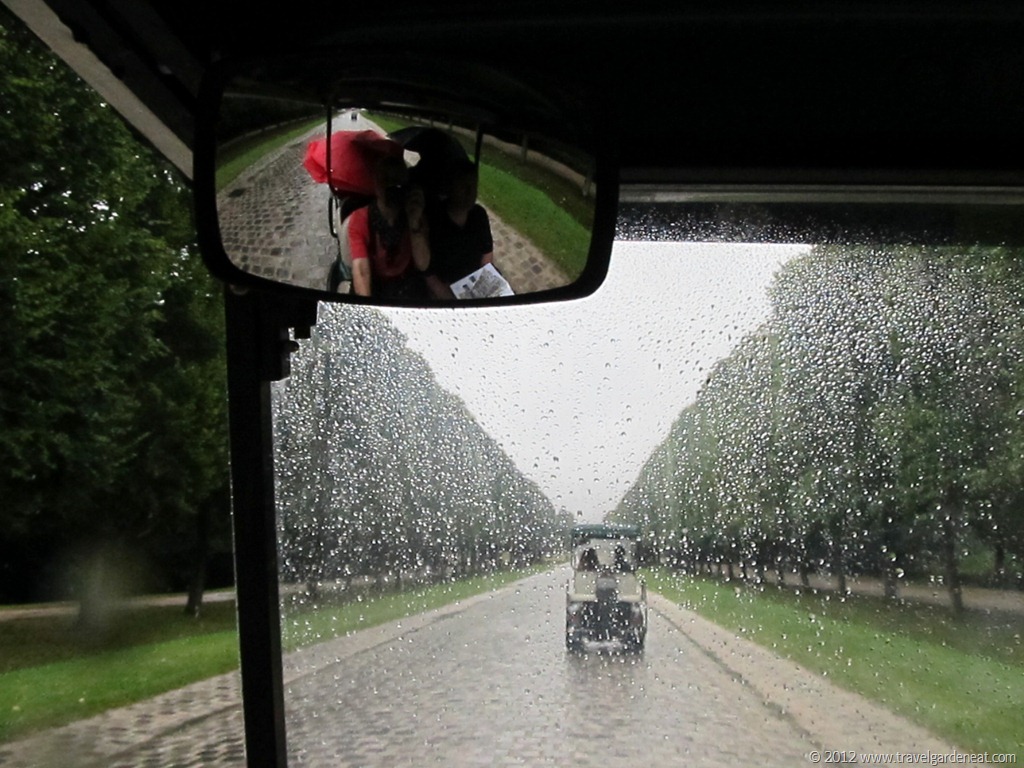 And then I saw the golf carts — motorized, timed golf carts for which you paid an exorbitant rental charge (particularly given the Euro-U.S. Dollar exchange rate that summer) to toodle about the gardens. SOLD (or at least rented for a couple of hours)! That cart appeared to me as good as a limousine at that point, with a canopy overhead and feet off of the wet ground.