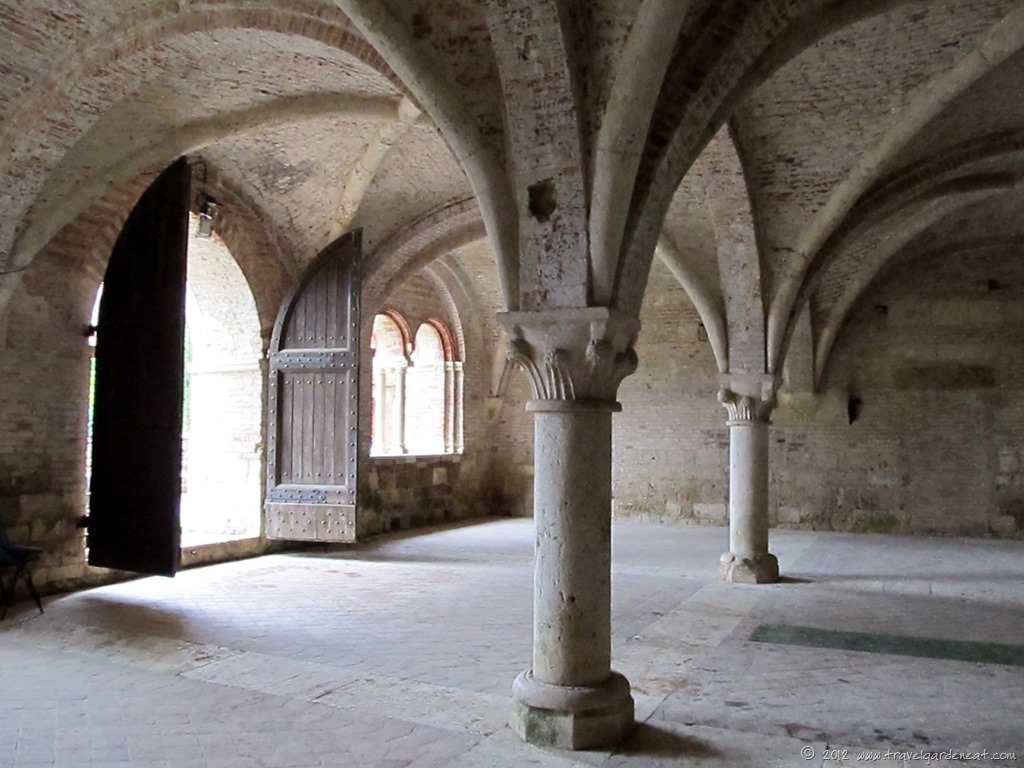 Description from San Galgano’s website: The Sala Capitolare, twelve meters length and sixteen width was the meeting place of the community. In the center are two stocky columns supporting six cross vaults.