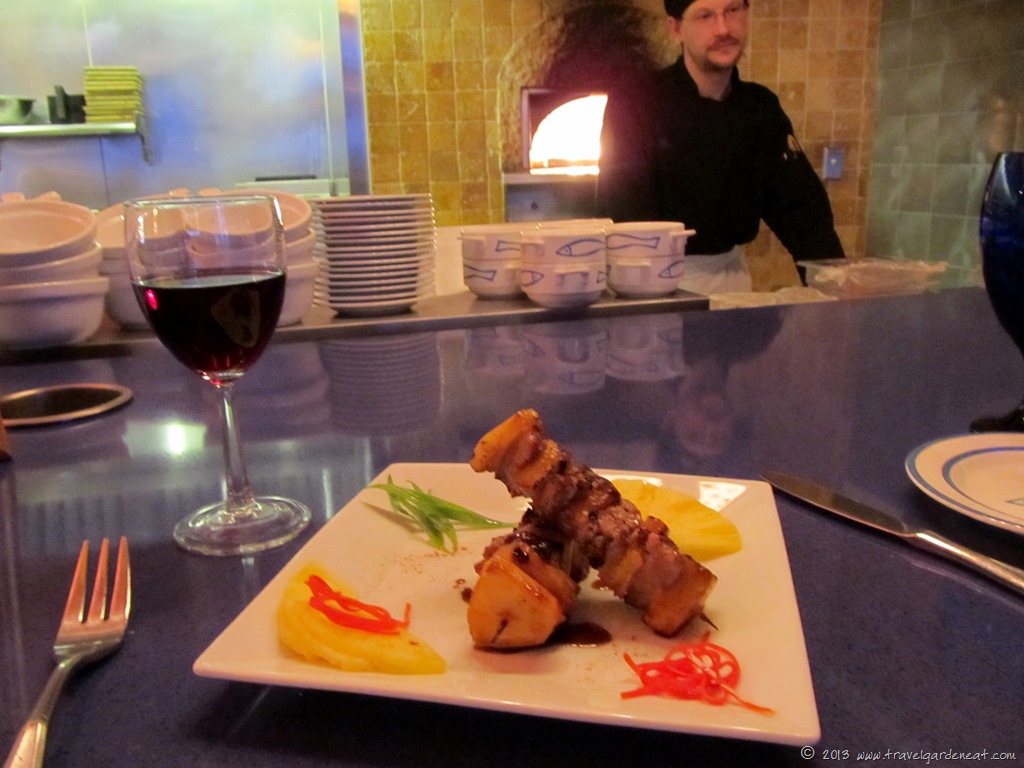 The Hawaiian Pork Kabob that “our” chef, Nate, prepared ended up being our favorite course. My husband already was scheming how to replicate it before he had a second bite. The teriyaki sauce did not overpower, but was a nice light glaze companion to the grilled pork tenderloin and pineapple pieces. A Pinot Noir was poured with this course. Nate kindly shared with my husband the general ingredients for the teriyaki glaze recipe and I look forward to my husband’s rendition of this tasty dish in the near future!