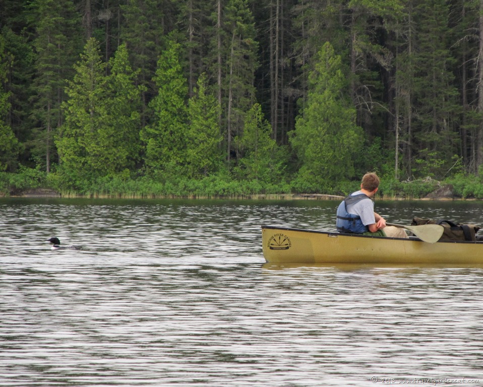 We finished our seventh portage of the day, and finally found ourselves in Long Island Lake, with the goal of setting up camp on the island closest to the portage.  A pair of loons greeted us as we began paddling toward the island.  My sons lifted their paddles and just floated along for a short while, until the loons swam past their canoe.