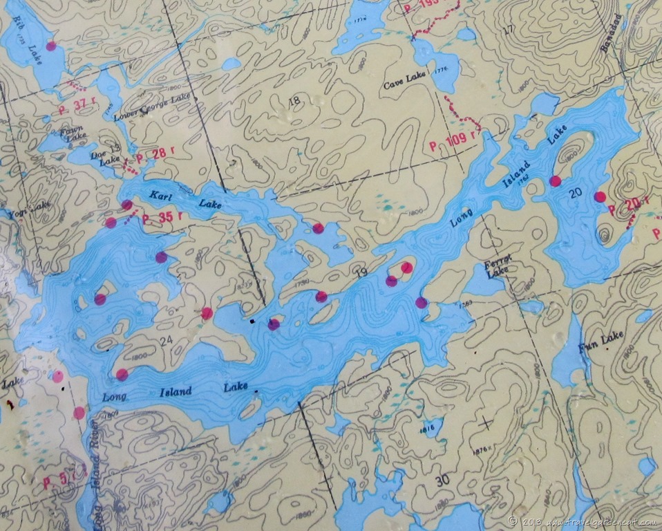 A pair of eagles must have been nesting nearby, as the boys saw the two of them perched in this dead tree along the shore, but by the time we paddled close to it, only one remained. Frequently during our stay on Long Island Lake we would see one or both of the eagles perched in one of the burned out trees from a fire several years ago, or flying low over the lake looking for their next meal.
