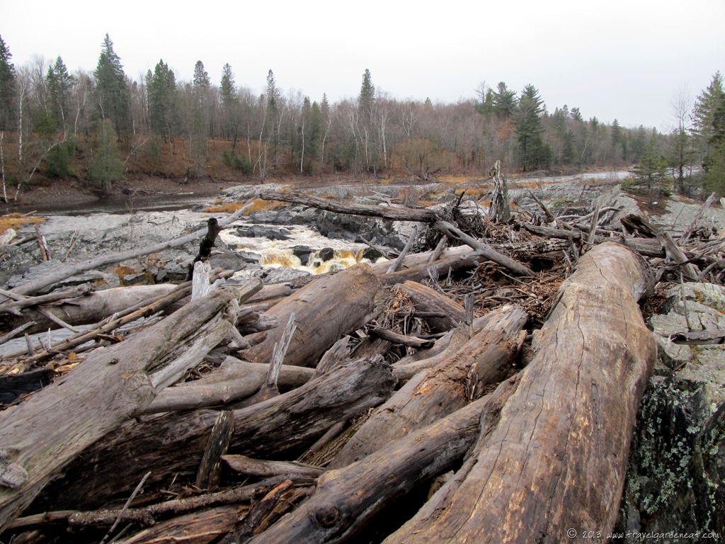 In the photo above of the swinging bridge, a rocky outcropping is identifiable to the left of the fast-moving water.. As we clambered over fallen trees and slippery rocks, we were able to inspect this tangled pile of large trees and branches, already taking on a weathered look as they face their second year on the rocky point.