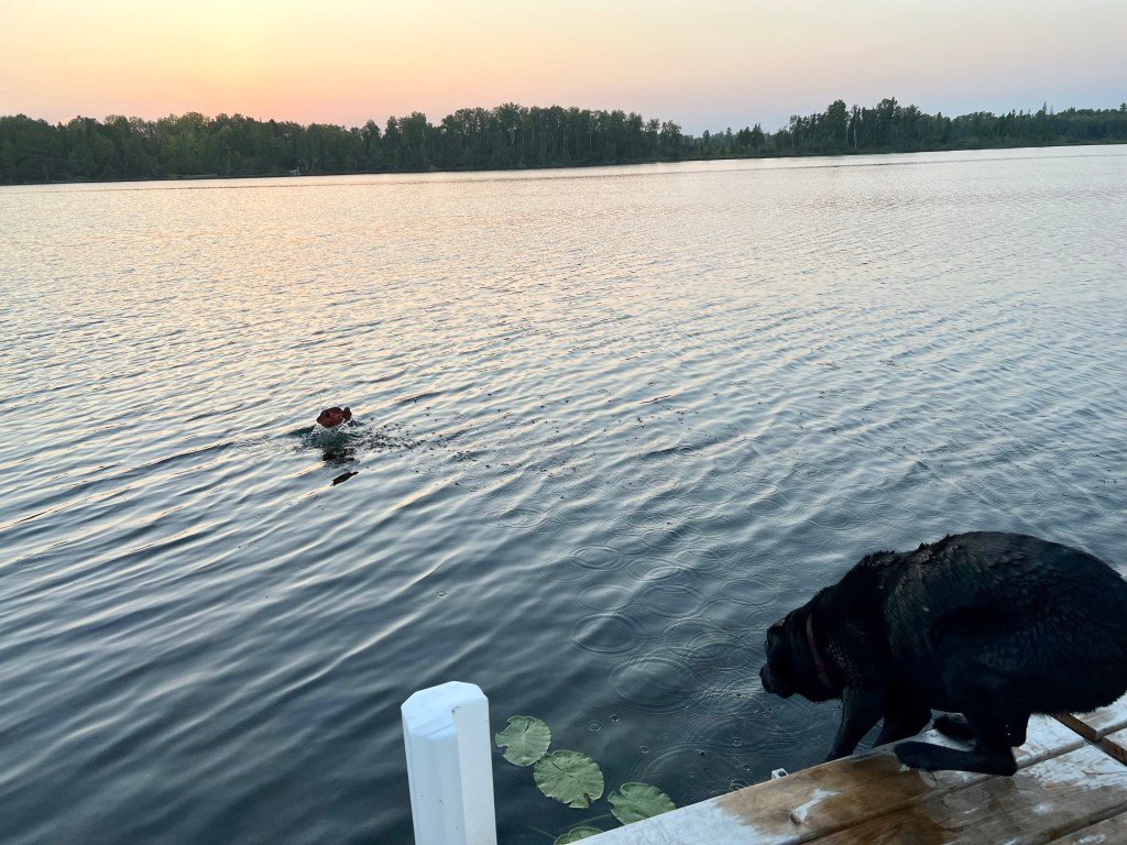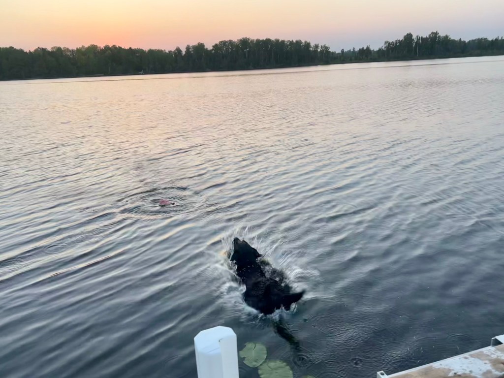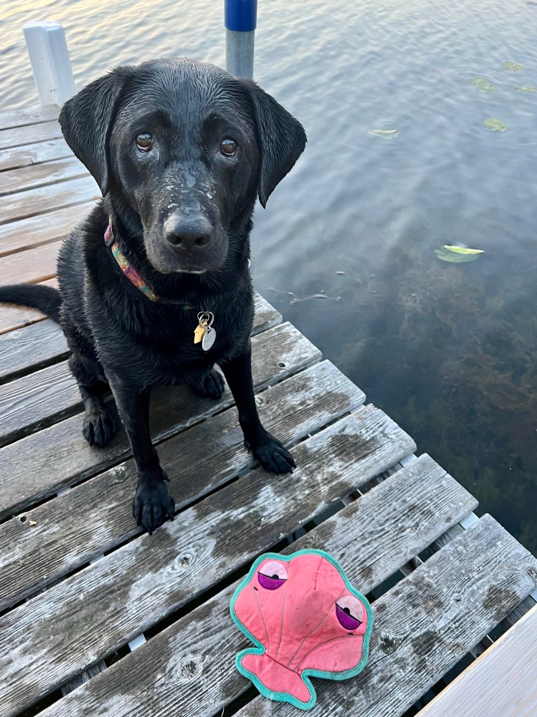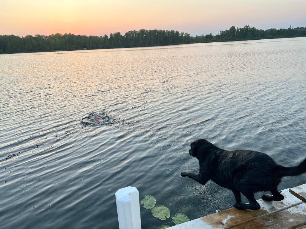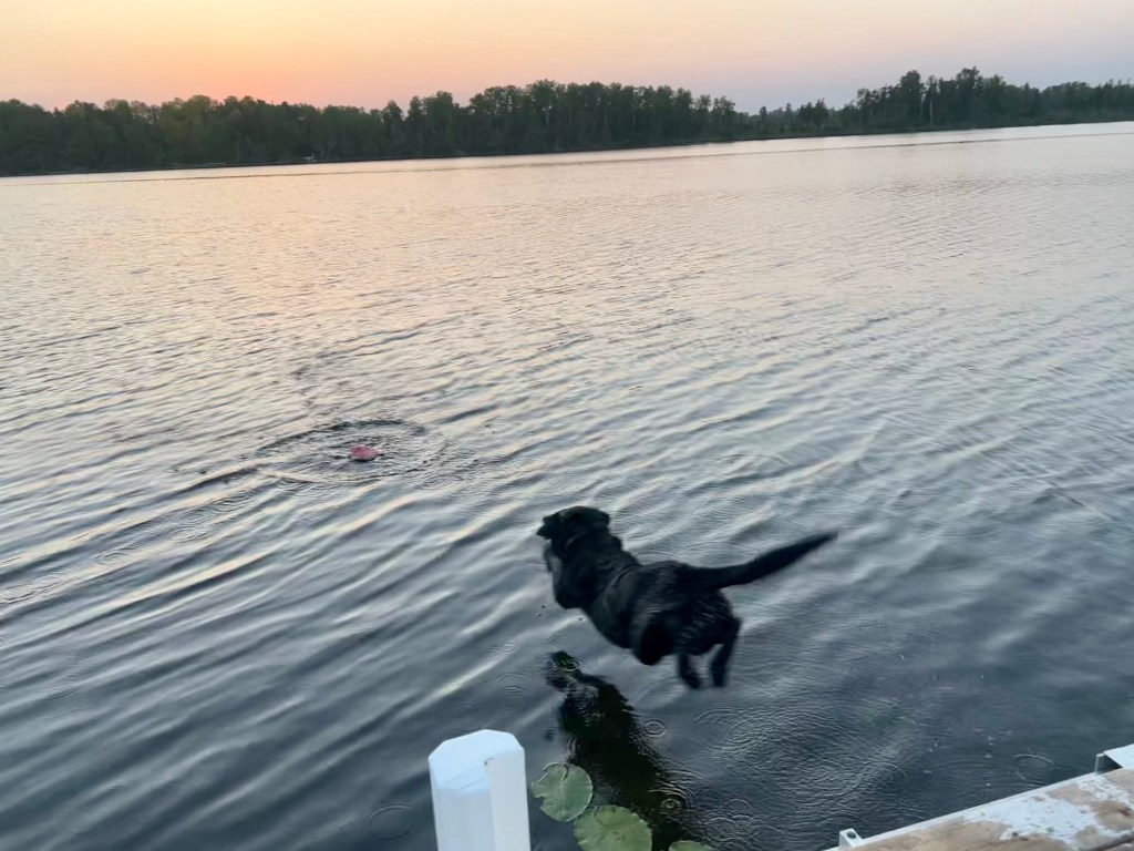 Old dog, new tricks … finally after 9.5 years, Winnie has learned how to leap off the dock to retrieve her toy.