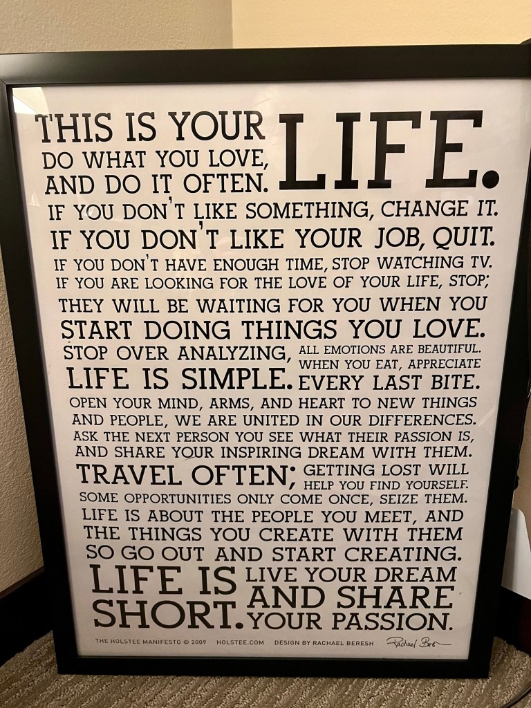 This poster sits in the corner of one of the rooms I periodically use as a home office when working remotely. Good reminders from the Holstee Manifesto.